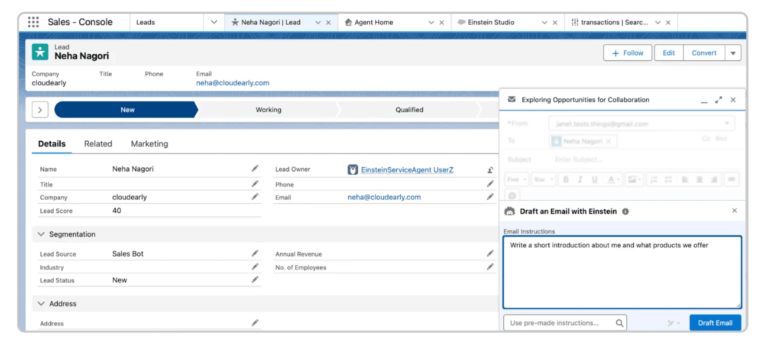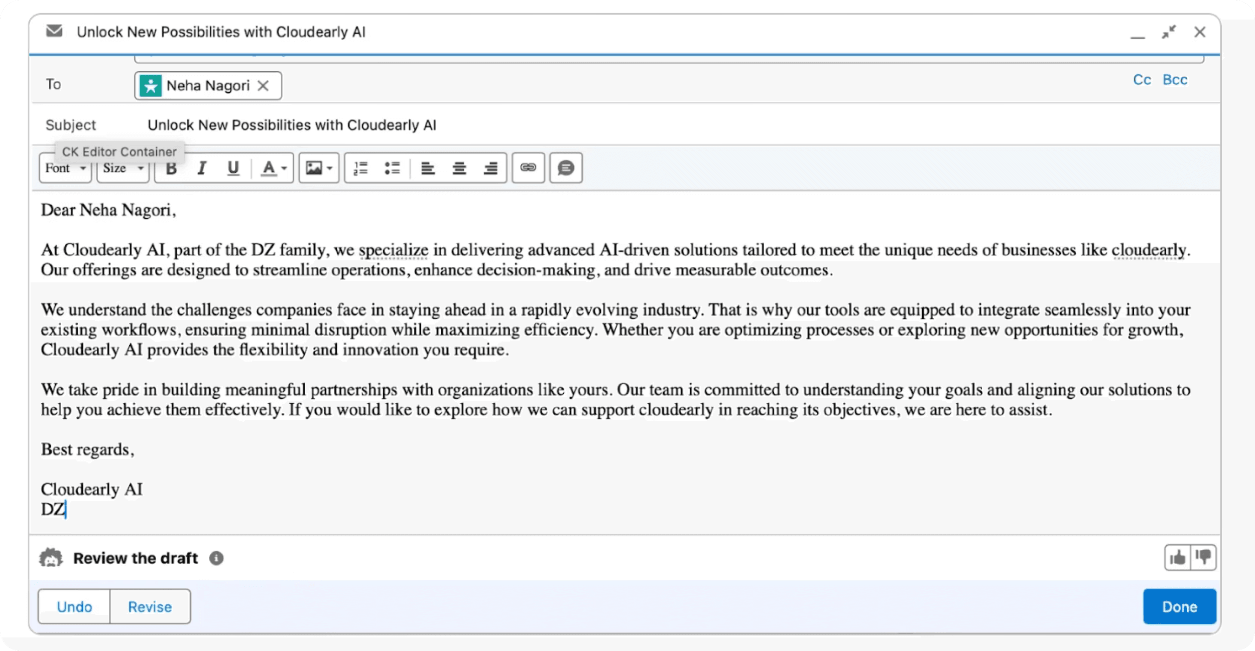 Einstein Draft Email is your built-in writing assistant inside Salesforce. It automatically generates contextual, personalized email drafts based on CRM data, past conversations, and customer details.