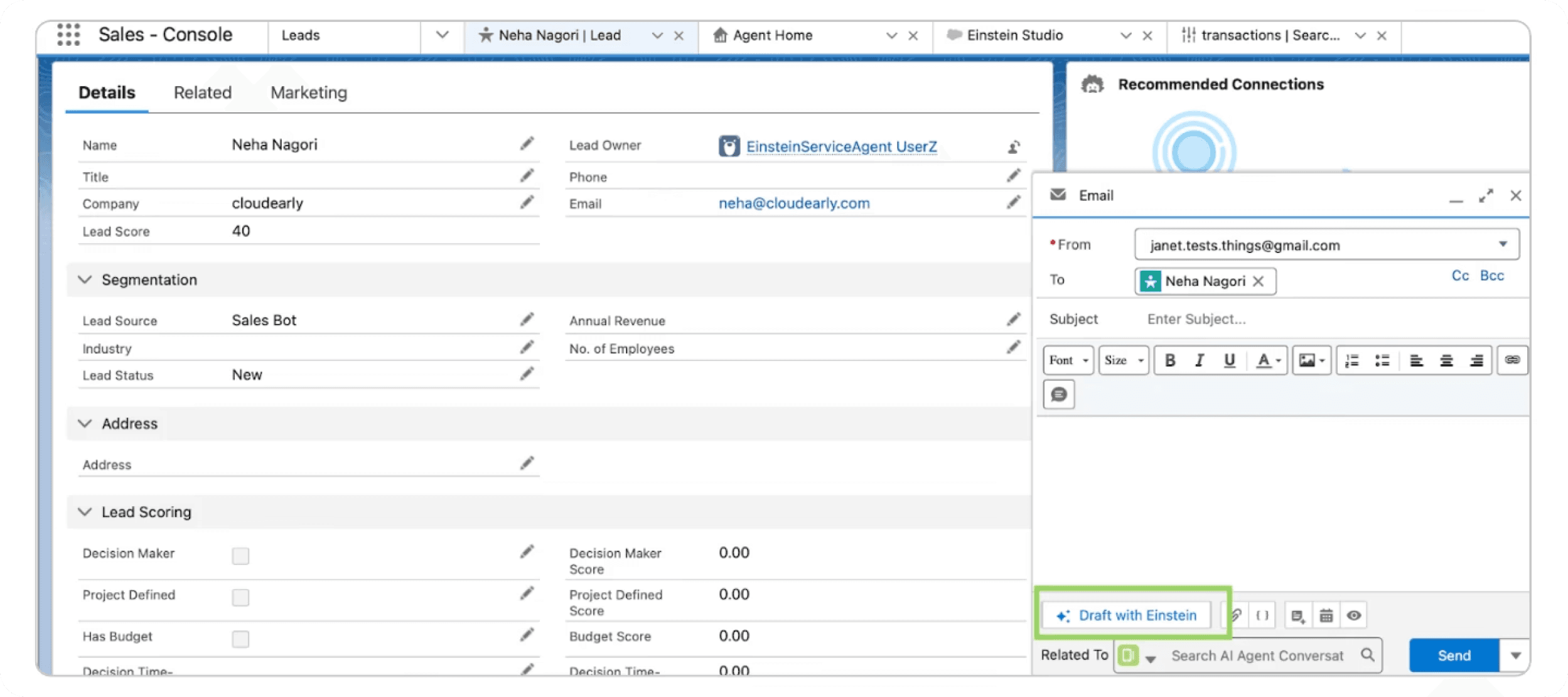 Einstein Draft Email generates contextual drafts directly inside Salesforce’s email composer: