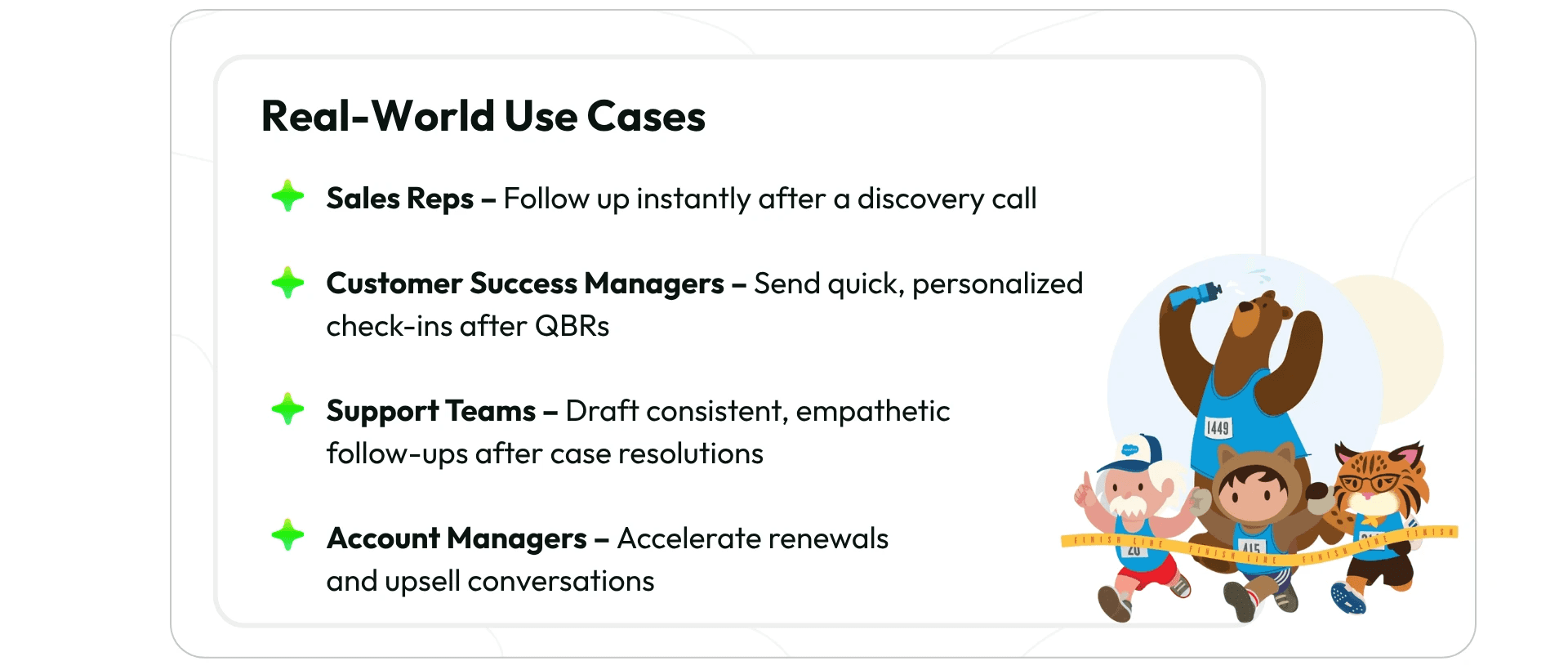 Contextual Drafting – Uses Salesforce records, activities, and past emails