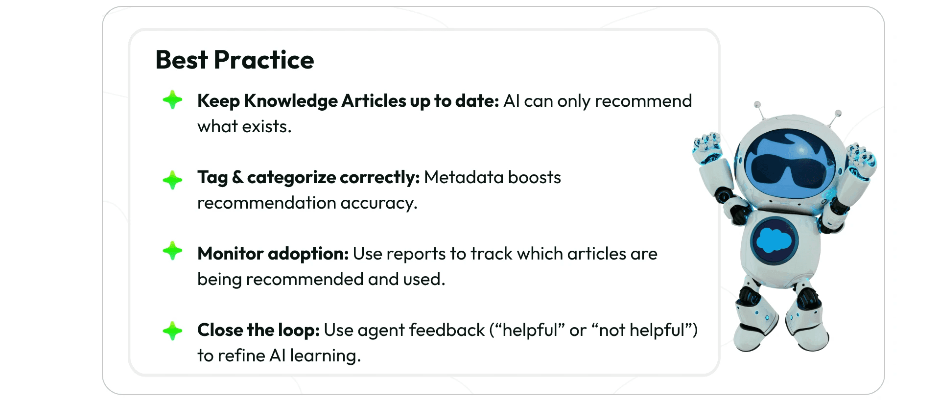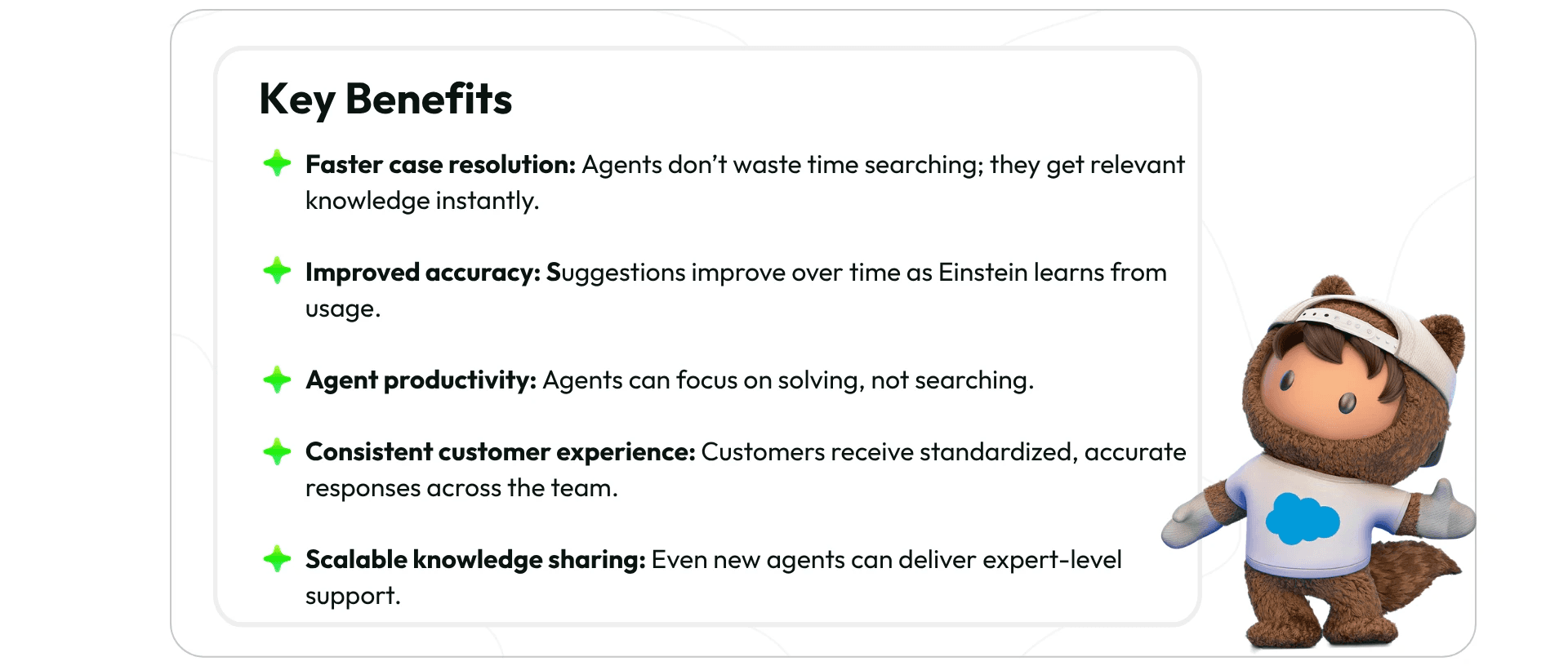Einstein Article Recommendations transforms your knowledge base into a proactive support tool. By analyzing past case patterns and serving up the right articles, it saves agents time, improves consistency, and helps resolve customer issues faster.