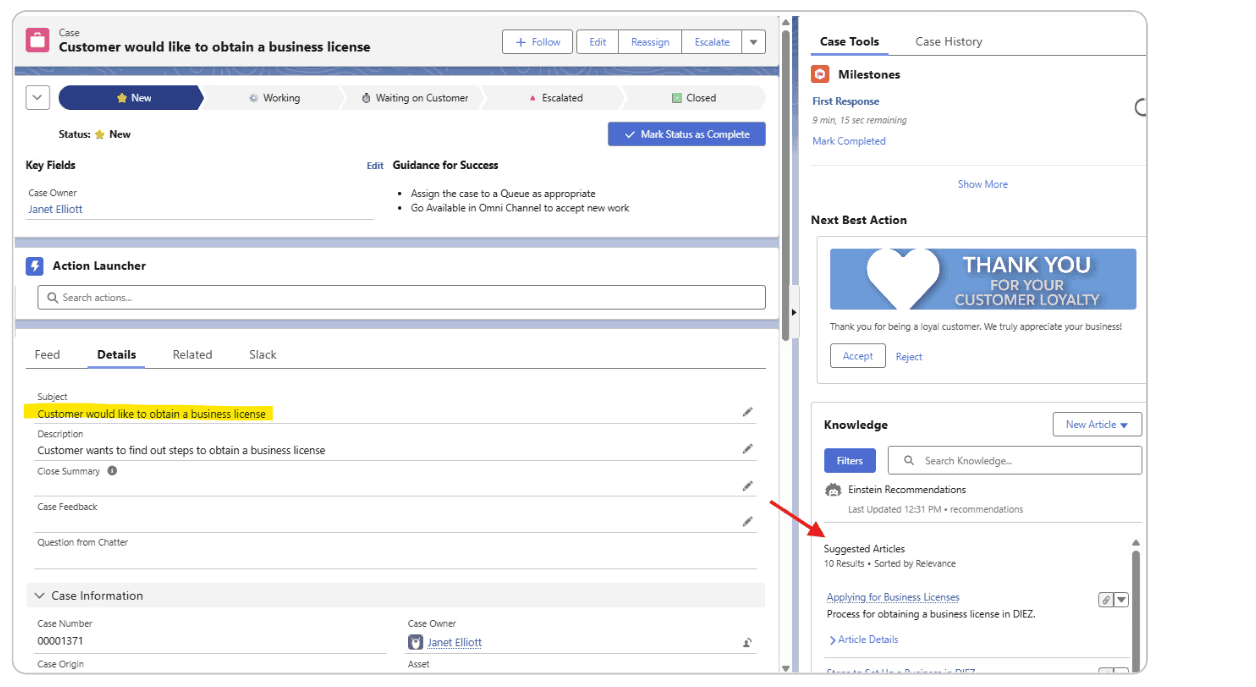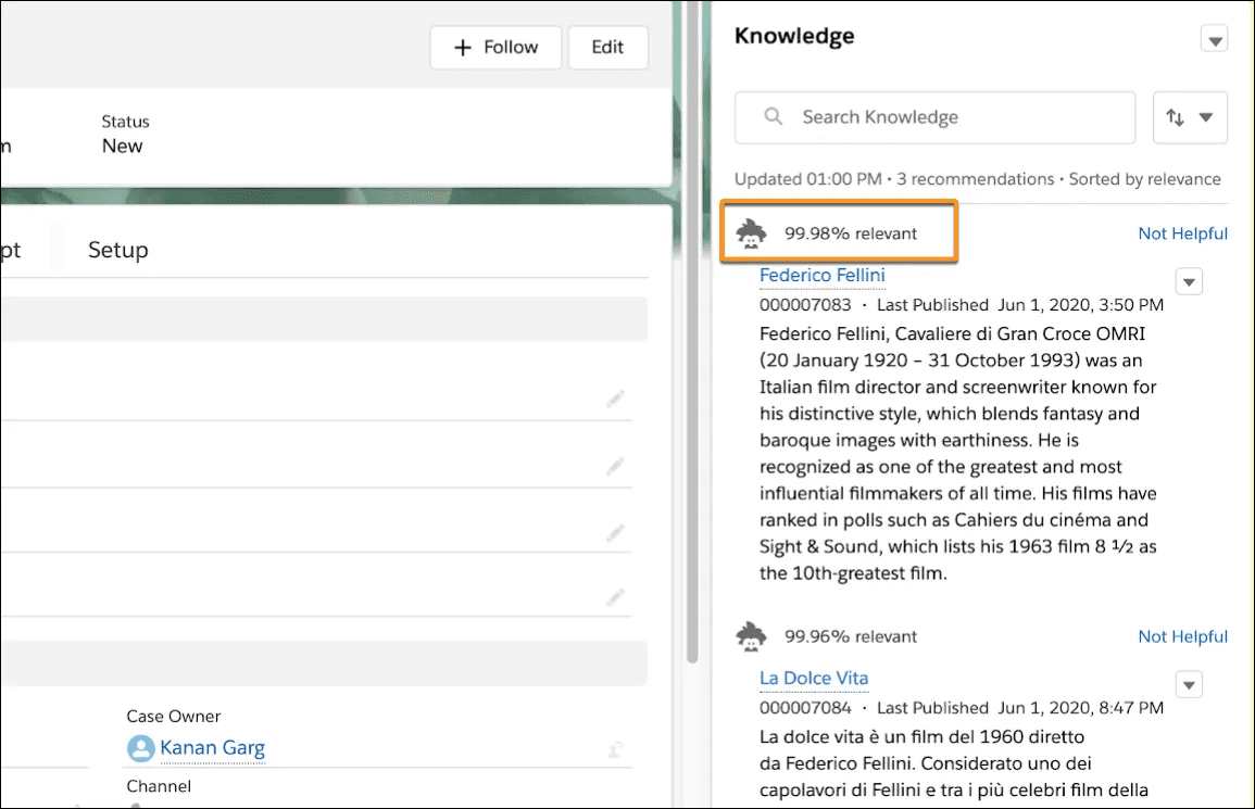 Proactively examines new cases, identifies key language and patterns, and recommends articles most likely to resolve the issue.