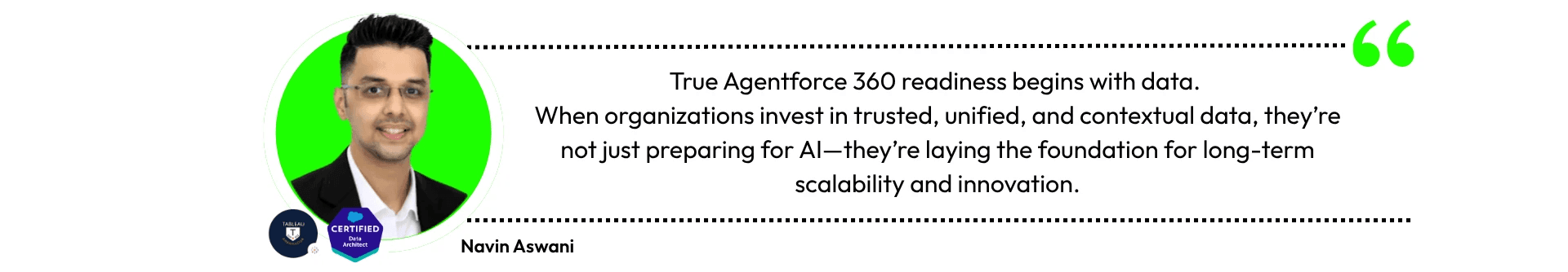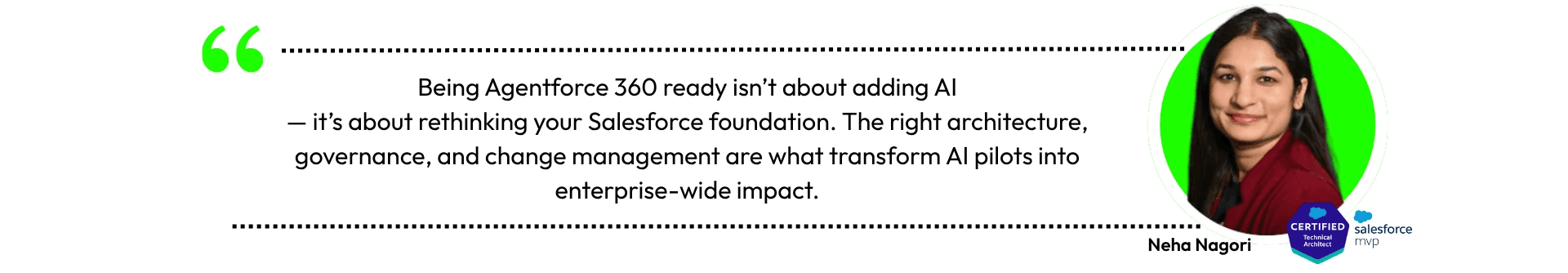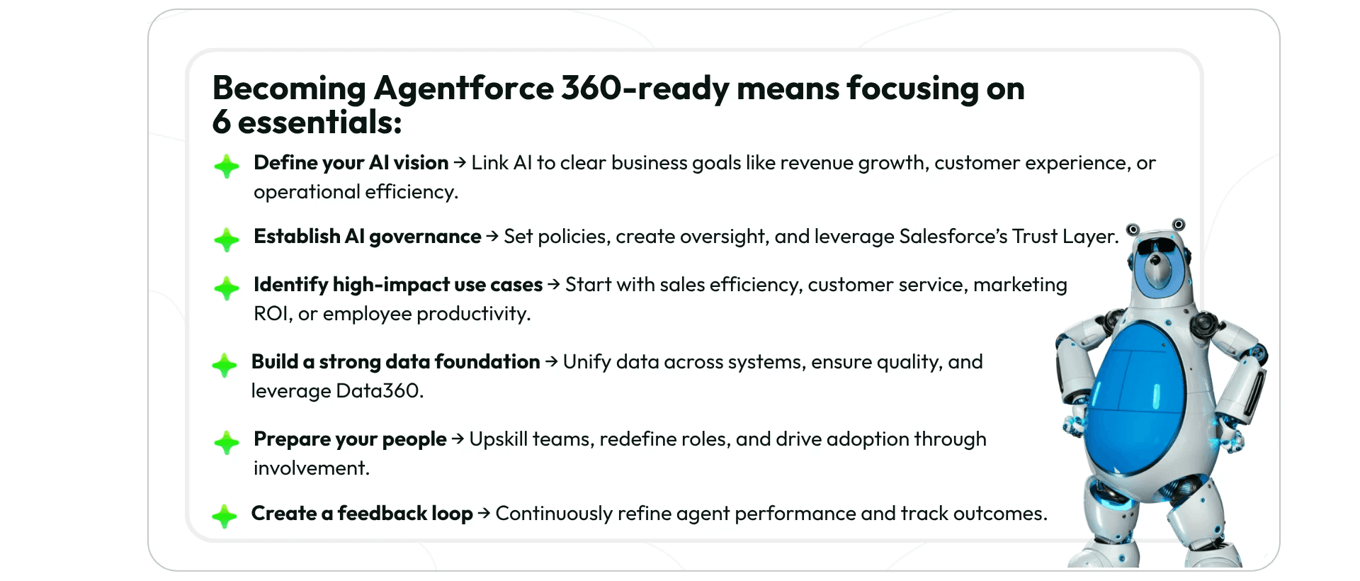 Becoming Agentforce 360-ready isn’t just about enabling features—it’s about building a vision for AI, a governance framework, and aligning agents with business goals.