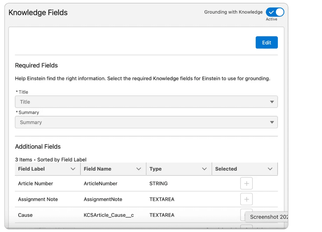 Choose Knowledge or Case fields for grounding so Einstein can draft responses using your articles.