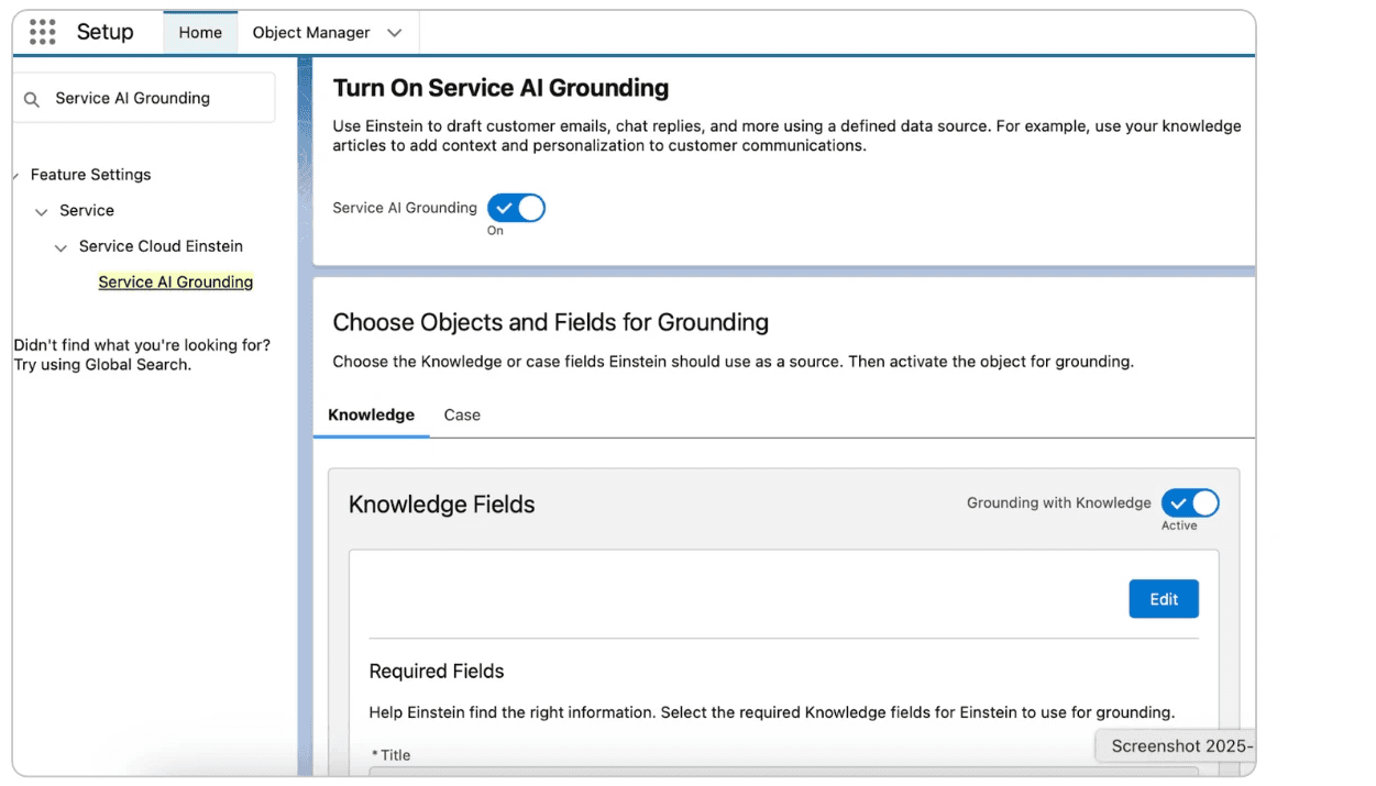 Go to Setup → search for Service AI Grounding → turn it on.