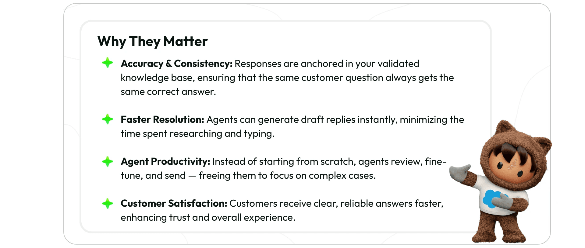 Knowledge-Grounded Emails are AI-generated responses that use your organization’s Salesforce Knowledge Base as a foundation. Instead of drafting generic or templated replies, Salesforce AI pulls directly from verified articles, FAQs, and solution records. The result: every email response is grounded in trusted information, reducing the risk of errors or inconsistent messaging.