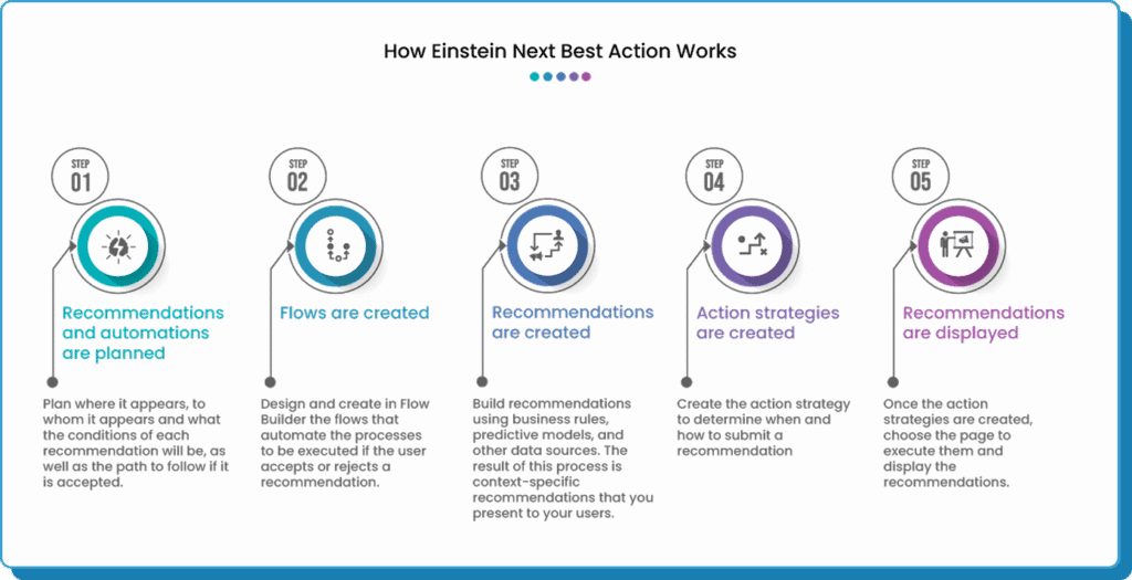 Through the Einstein Next Best Action component, users see recommendations directly in Salesforce pages (record, home, app, or Experience Cloud). Accepted or rejected actions are tracked with visual indicators—ensuring clarity and accountability.