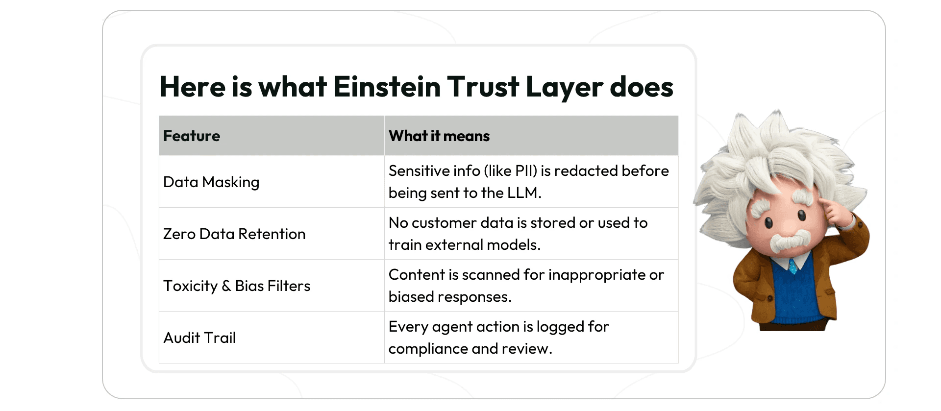 The Einstein Trust Layer is Salesforce’s built-in AI governance engine. It ensures that AI agents behave responsibly and align with enterprise security expectations.