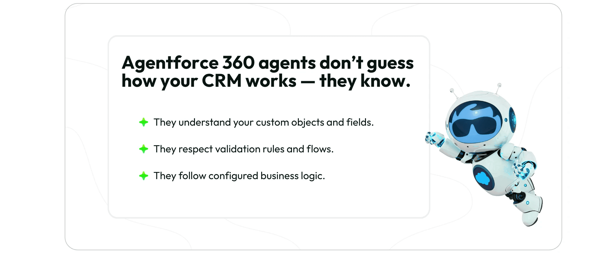 Example: If your case escalation logic is custom-built, your Agentforce 360 service agent will follow it. It won’t escalate blindly—it checks your setup first.