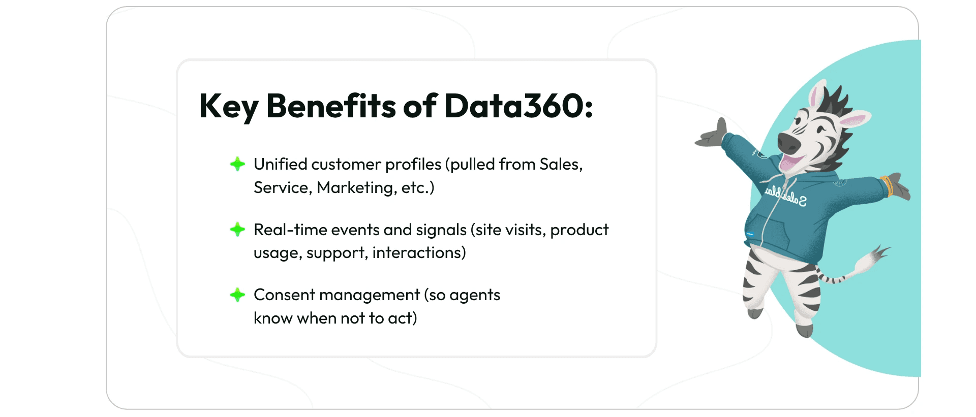 Example: Imagine an AI agent suggesting a loyalty reward to a customer who just churned — not a good look. With Data360, that churn data is captured in real time and the agent knows not to engage.