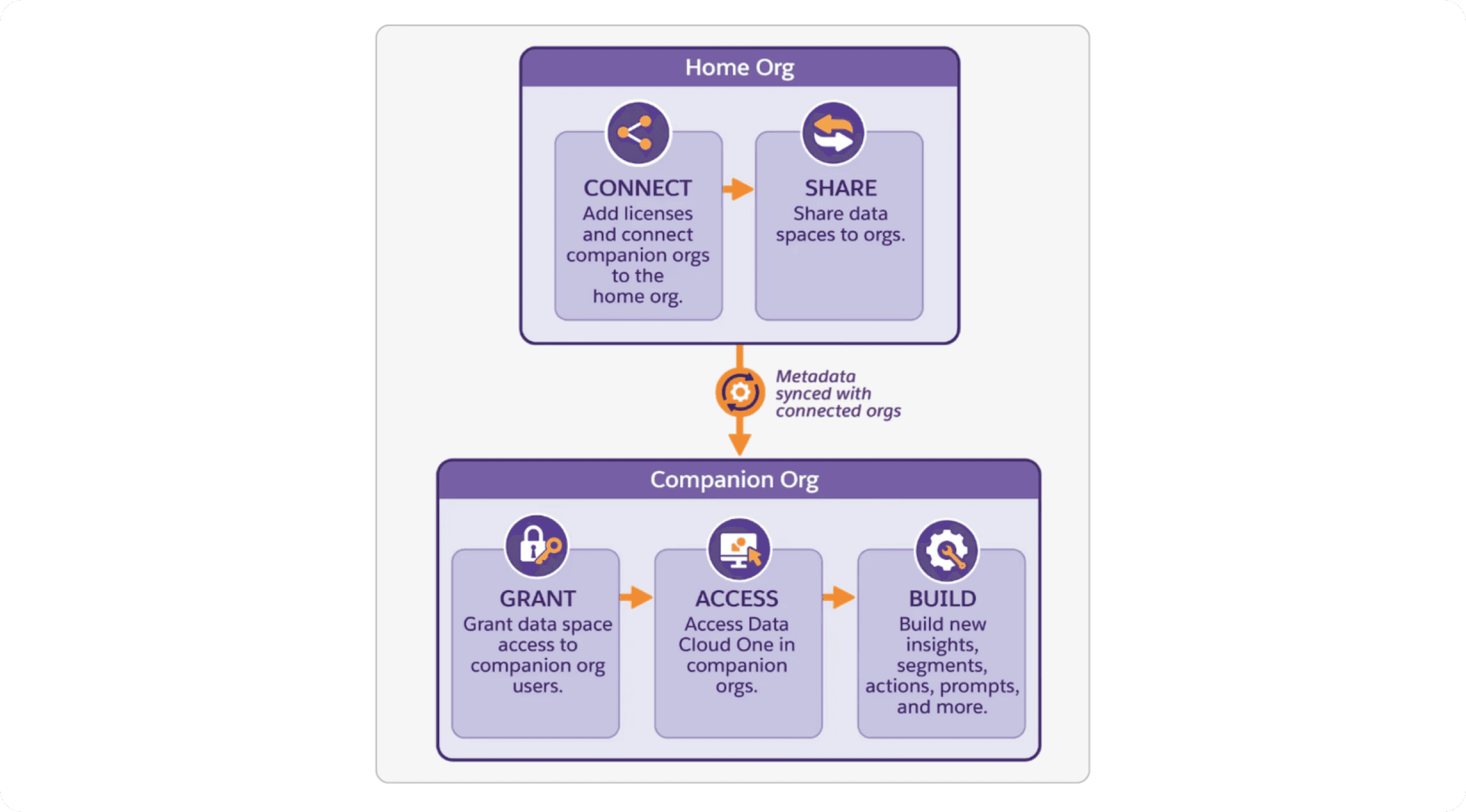 Connect companion orgs to the Home Org — Data Cloud handles metadata sync automatically.