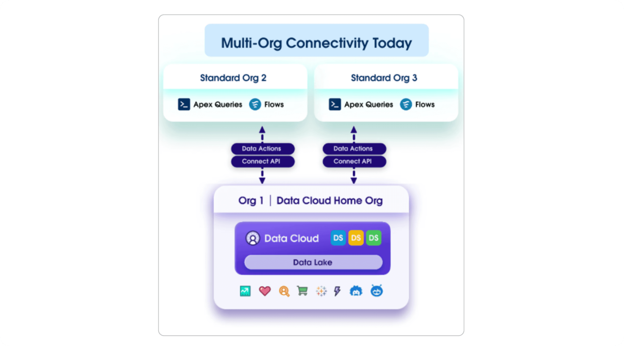 Instead of each org managing its own silo, Data Cloud One introduces a Home Org — the central foundation where all your data lives in one governed Data Lake.