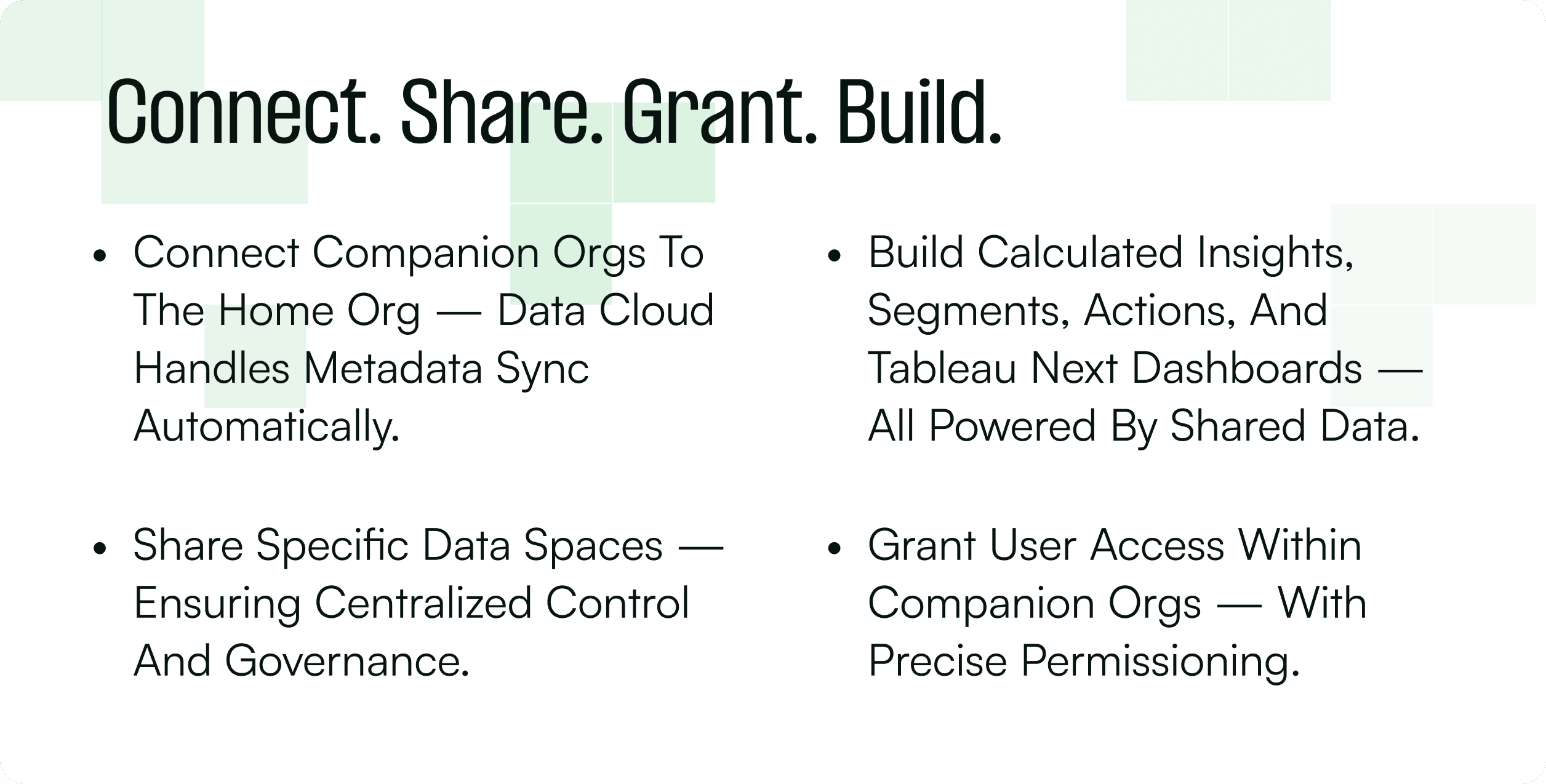 Build calculated insights, segments, actions, and Tableau Next dashboards — all powered by shared data.