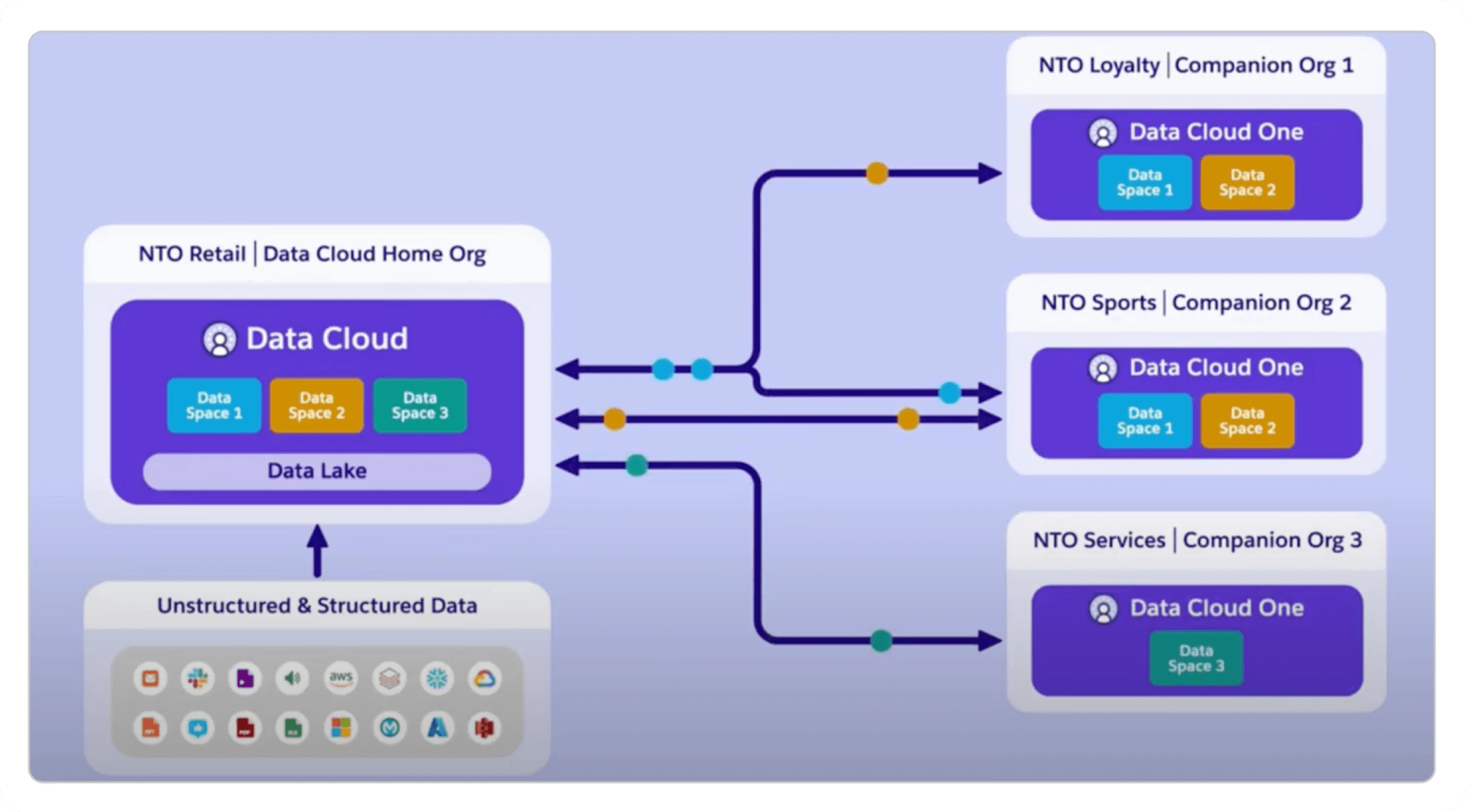 NTO Retail acts as the Home Org, integrating all data from AWS, Snowflake, Marketing Cloud, and Service Cloud.